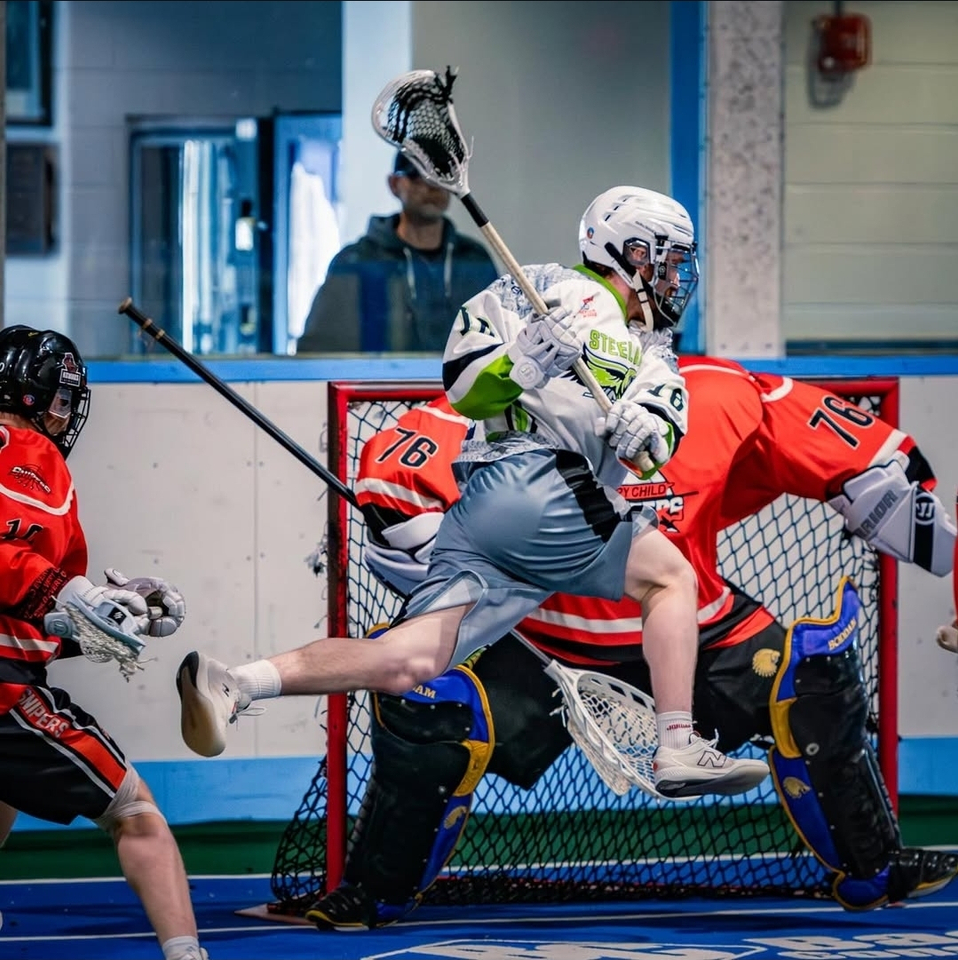 Veteran Steelhawk Devin Pipher scored twice in the final quarter including a bullet from high in the slot to give the homeside a 10-8 lead with 8:52 showing on the clock. One minute later, Chayton King answered for Six Nations to get back within one but both goalies played flawlessly the rest of the way and the score remained 10-9 for the Steelhawks.